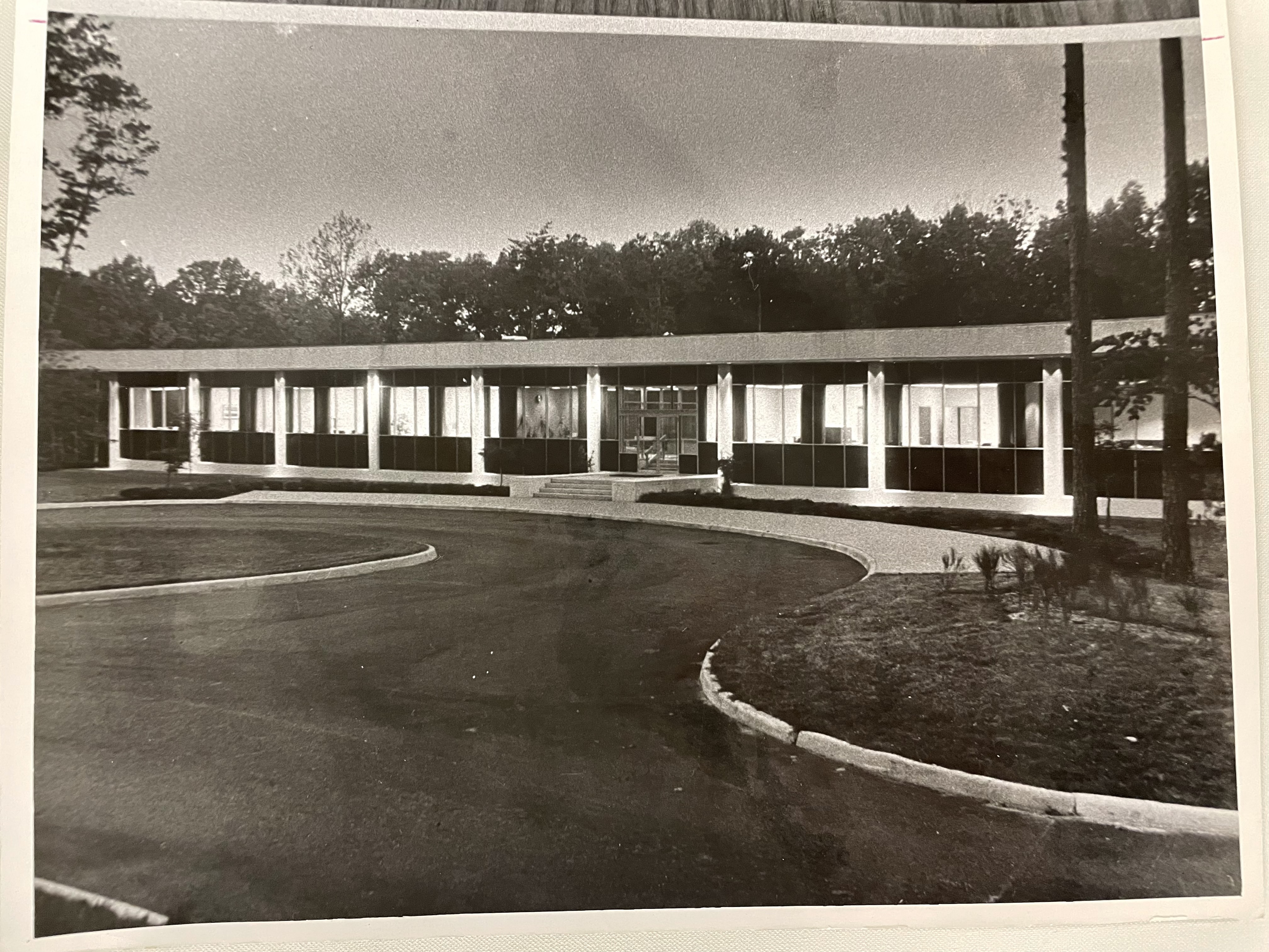 Centralized oversight would have been difficult as lead corporate staff was spread out in different locations in Danville. Before 1967, Dan River’s corporate officers were scattered between the 1903 Company Office Building, expanded once in 1921, and Hylton Hall, which had been a women’s dormitory but was remodeled for personnel offices in the 1940s. To centralized corporate officers, Dan River’s board began planning a combined headquarters for corporate staff in a centralized, off-site location. In 1966, the company announced that it had hired Carneal and Johnston, architects and engineers based in Richmond, to design and build a new headquarters on a segregated sixty-acre plot of land just west of the village of Schoolfield. These headquarters would be two floors, with a main entrance, reception area and cafeteria on the first floor, and a ground floor devoted to computers, which at that time required ample room for data processing. The main floor housed executive officers of the new consolidated organization that included the chairman of the board, the company president, and heads and principal officials of the finance, legal, cotton, research and public and industrial relations departments. John W. Daniel and Company, in Danville, was the general contractor for the building and the interior and surrounding landscaping was chosen with preference to outside vendors. The interior of the Executive Building was designed by Mitchell Associates from Wilmington, Delaware and the landscaping around the building was led by Stanley W. Abbott, a landscape architect based in Richmond, Virginia. The approach to the office swept in off Memorial Drive and curved along a wooded ravine, giving the grounds around the office a secluded, almost secretive feel.
