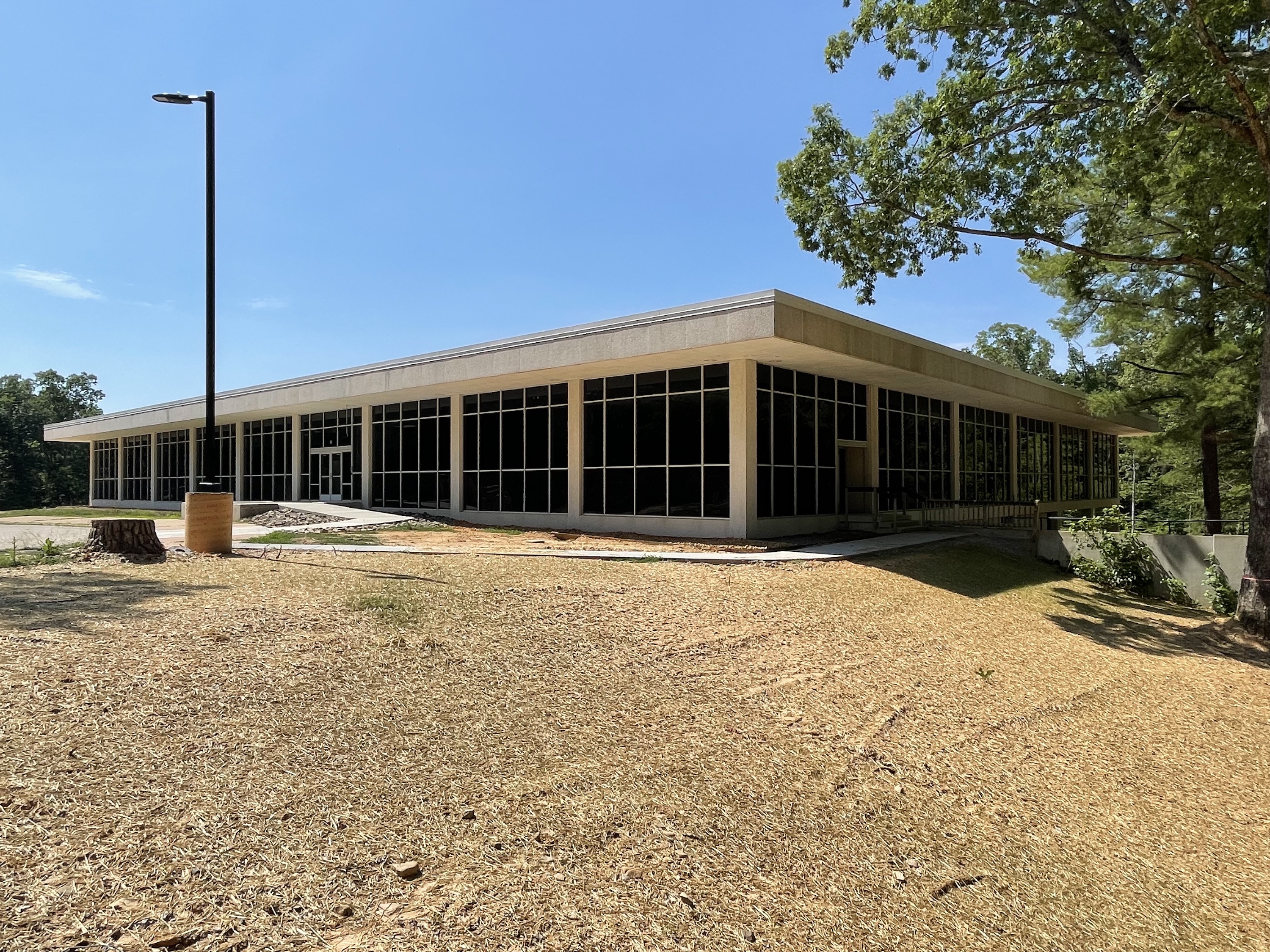 The Executive Office Building, now the Danville Police Department headquarters, stands to the south of the Dan River on the eastern shoulder of Memorial Drive. The building is located on a 60-acre large, wooded lot that slopes up southwardly from the river. The original two-story building is of concrete curtain wall construction with a 2022 addition to the rear of the building. The main floor exterior walls are faced with large plates of glass in aluminum-frames and the lower-level exterior walls have a stucco finish featuring white crushed rock. The lower story is open on the rear northern side of the building with concrete columns covered with similar white crushed rock stucco. The building’s flat concrete roof extends out from the main building plane to shelter the glass walls of the main floor. The main floor entrance contains single-leaf, glass aluminum-frame doors with sidelights. The basement entrances to the courtyard contain single-leaf, aluminum-frame doors with transoms. The basement entrances on the exterior walls contain single-leaf and double-leaf flush metal doors.