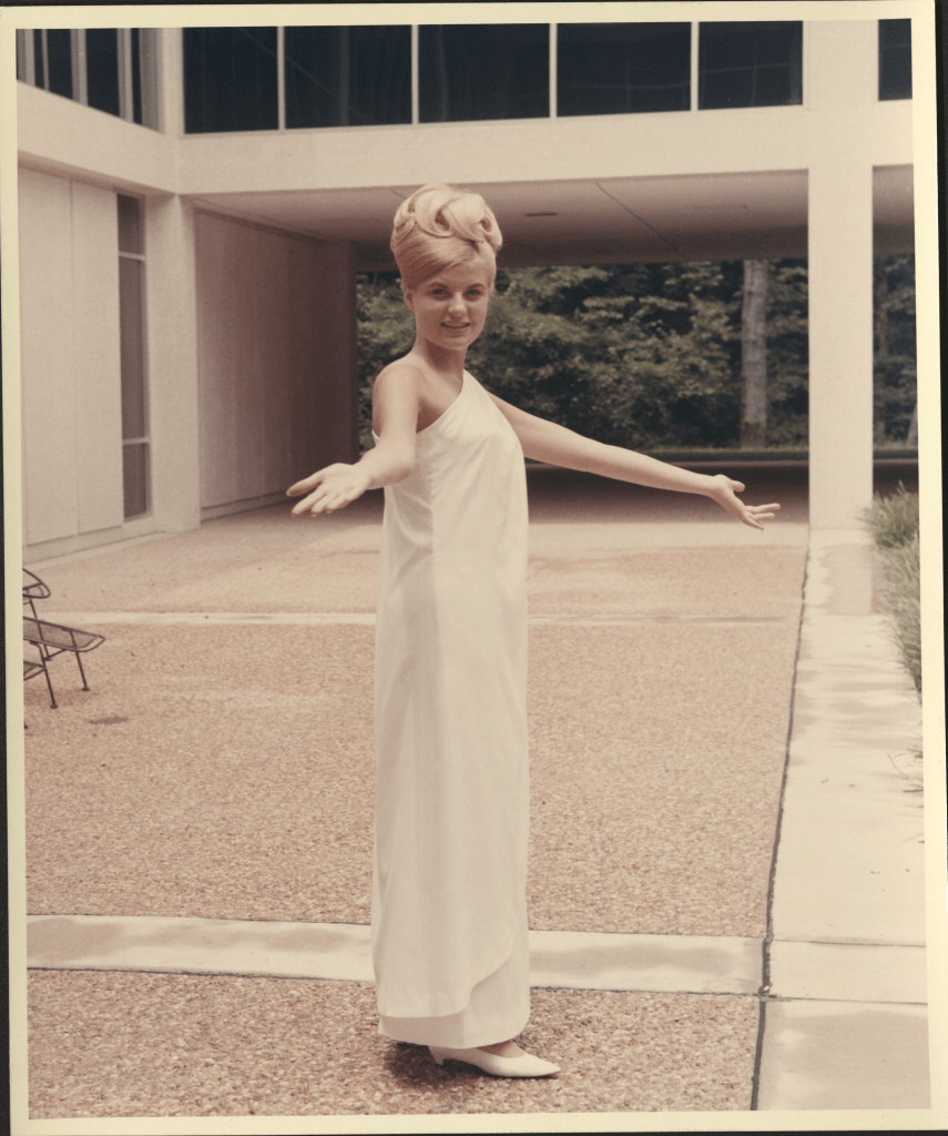 The 1968 Ms Danville shows off her fashion style in the courtyard of the Dan River Executive Building. Courtesy of UNC-Chapel Hill Wilson Library’s Southern Historical Collection Dan River Inc. Papers.