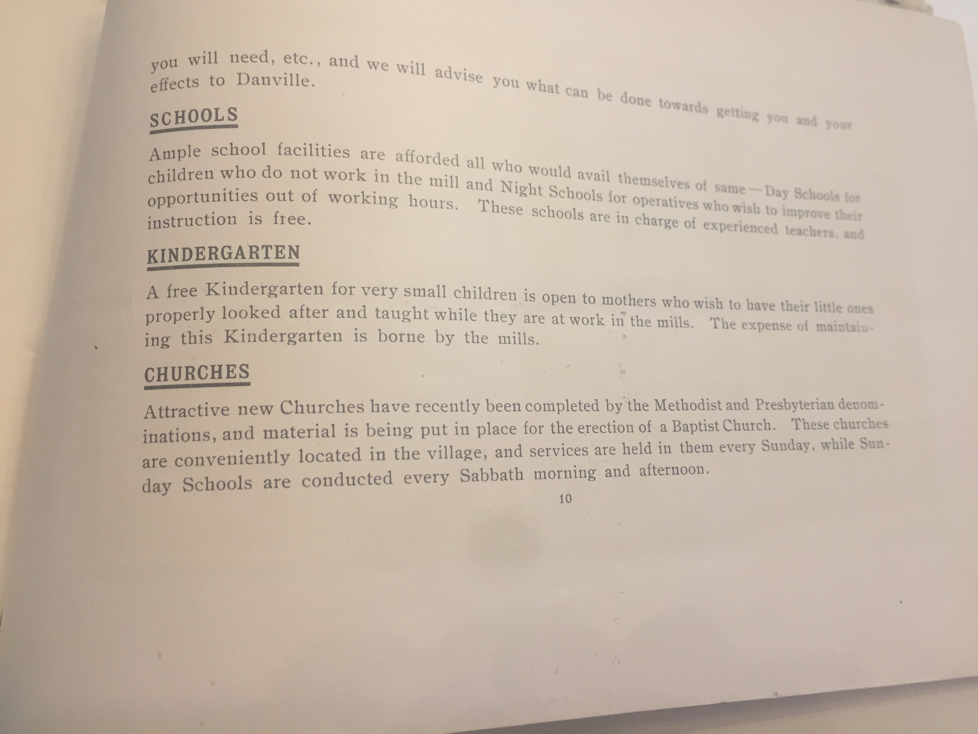 A 1910s Dan River Mills booklet with summary of village community amenities. Courtesy of Judy Edmonds.