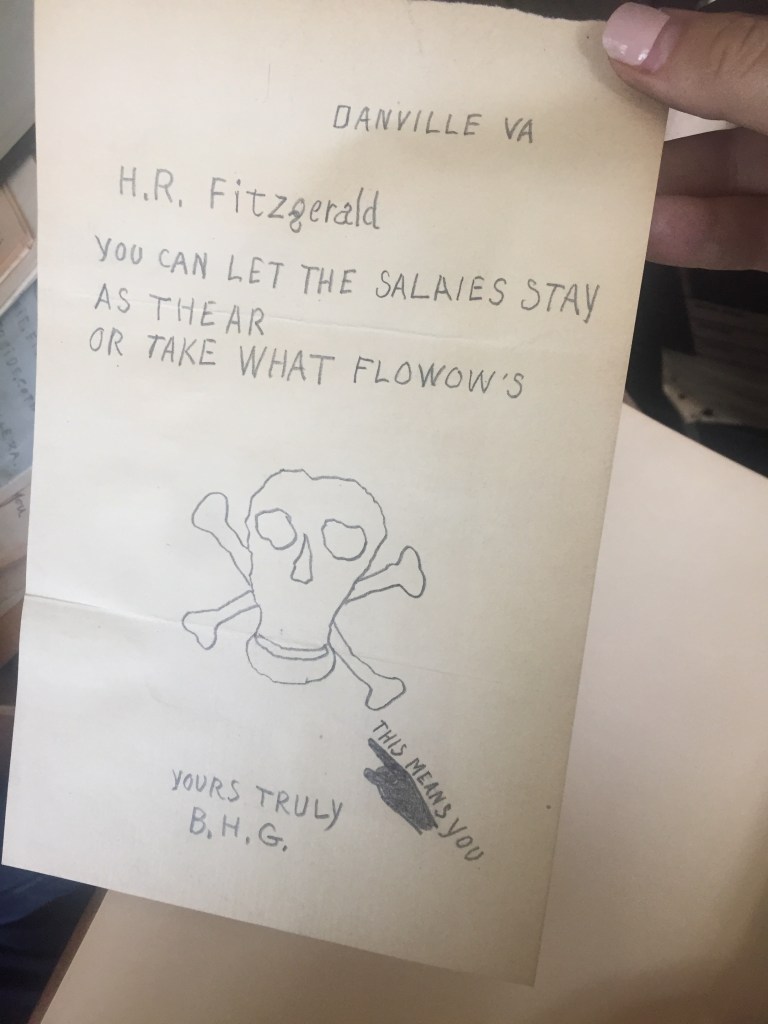 Tensions ran high in the labor strike at Dan River in the winter of 1930 and 31 as this anonymous letter to DR President H.R. Fitzgerald shows. Courtesy of UNC-Chapel Hill Wilson Library’s Southern Historical Collection Dan River Inc. Papers.