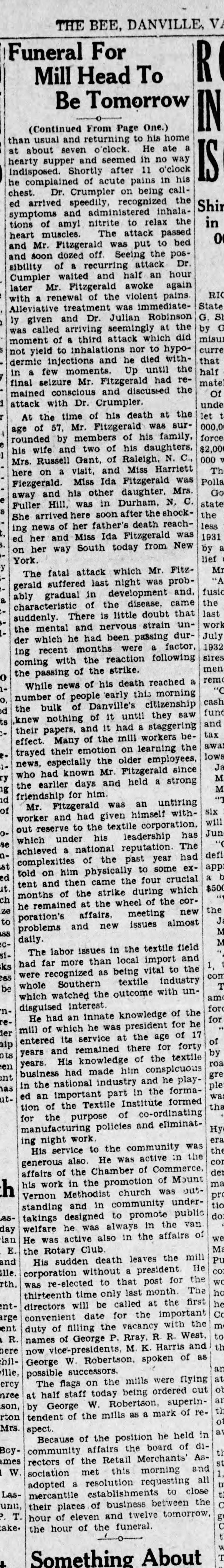Fitzgerald’s untimely death was attributed to the stress of the strike at Dan River. “HR Fitzgerald Dies Unexpectedly,” The Bee. February 24, 1931, p 1. Fitzgerald was so well known and regarded in the textile industry that even the New York Times noted his death (see below). “H.R. Fitzgerald, Textile Man, Dead, The New York Times. February 24, 1931. New York Times Machine.